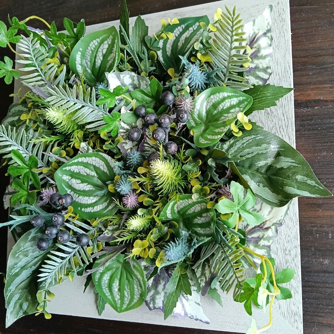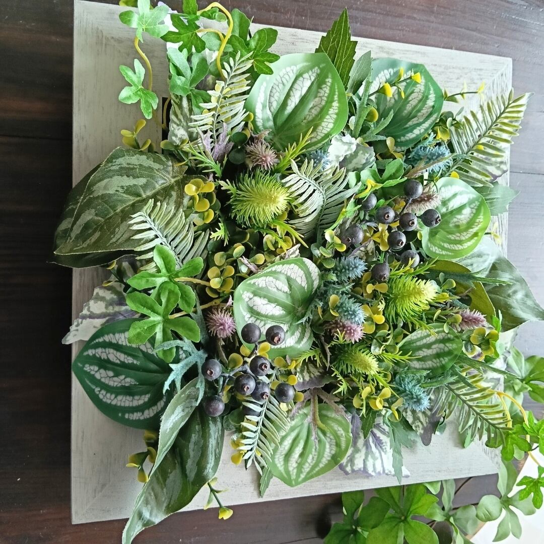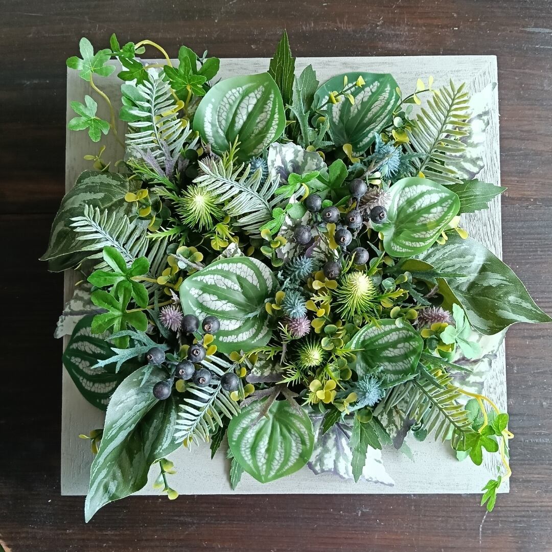 あたたかな木製フレームに、みずみずしい表情のグリーンをバランスよく寄植えした、スクエア型(正方形)の壁掛けフェイクグリーンです。